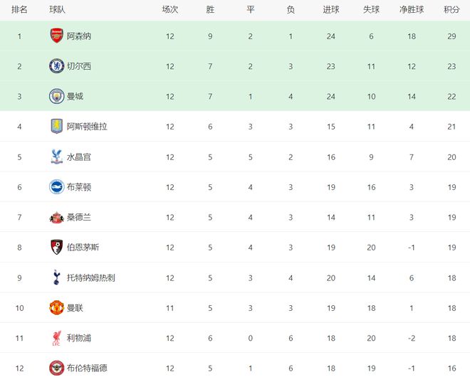 本赛季英超第12轮基本结束,只剩下曼联VS埃弗顿的比赛,但不影响积分榜的整体排名。领头羊阿森纳主场4-1大胜热刺之后,将领跑优势扩大到6分,切尔西、曼城分列第二、第三,卫冕冠军利物浦本轮0-3惨败诺丁汉森林之后,排名已经跌至十一位,对比两个月之前的榜首,真是天差地别。