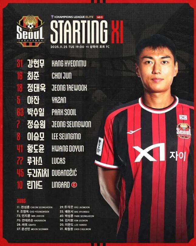 FC首尔首发:31-姜贤茂、18-郑泰旭、5-亚赞·阿拉伯、16-崔俊、63-朴秀日、7-郑承原、8-李胜模、10-杰西·林加德、41-黄度允、45-马尔科·杜甘季奇、77-卢卡斯·席尔瓦;