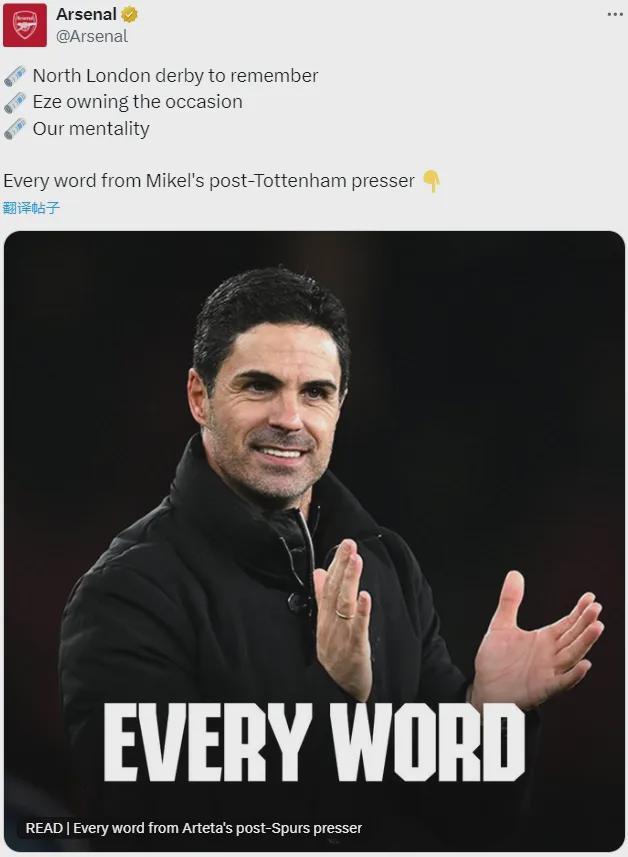 阿尔特塔出席了赛后新闻发布会,我们来看看阿森纳主帅的发言。