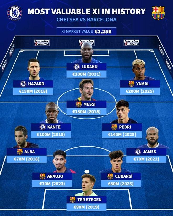 北京时间11月26日,切尔西将在欧冠联赛阶段第五轮的比赛中主场迎战巴塞罗那。赛前,德转为本场比赛预热,列出了两队加起来的历史最贵阵容。这套阵容的总身价达到了12.5亿欧元,其中梅西、亚马尔、阿扎尔、坎特在列。