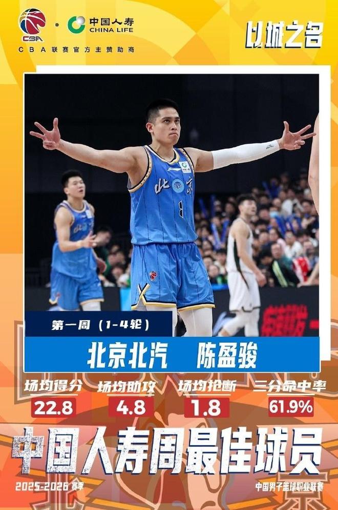 CBA官宣首周周最佳:陈盈骏率北京4连胜第一 56分外援当选