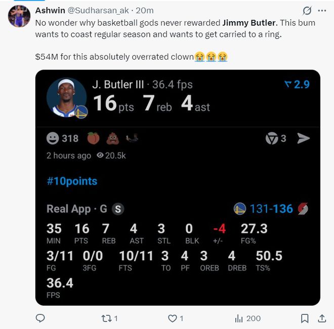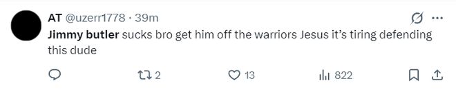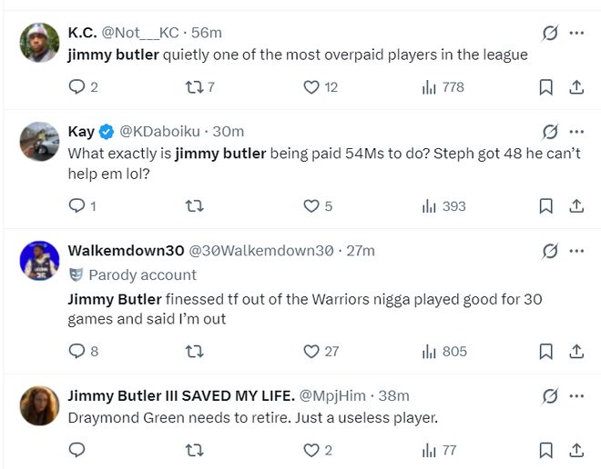 还有很多勇士球迷怒喷巴特勒是联盟最高薪低能的球员,拿5400万什么都做不到。